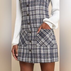 Lulus Posh Arrival Navy Blue Multi Plaid Tweed Mini Dress! Sturdy woven tweed, in a classic plaid pattern, shapes this cute dress that has wide tank straps, a crew neckline, and a princess-seamed bodice with a functional button placket at the front. Skirt boasts twin patch pockets, and a flirty mini hem completes the look.