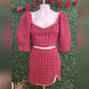 Brand New with Tags Tweed Puff Sleeve Top with gold chain details and Mini Skirt. Zipper Closure on the side of the top and back zipper on the skirt. Color is Garnet. Final Sale! No return no exchange
