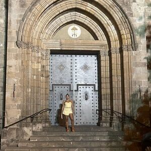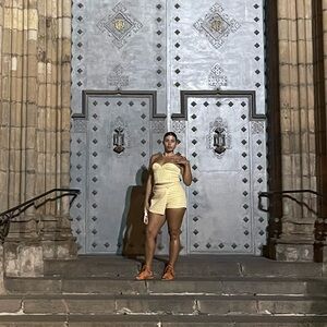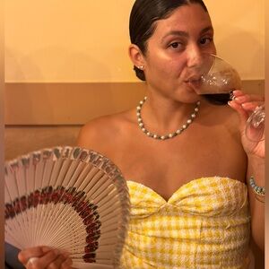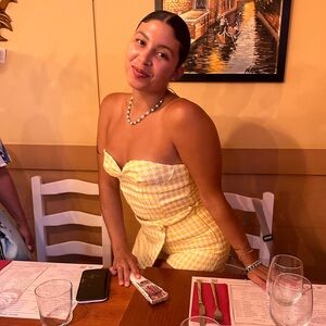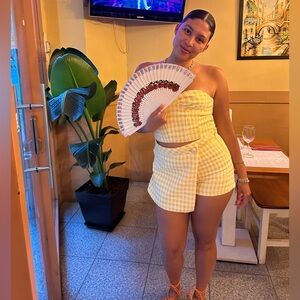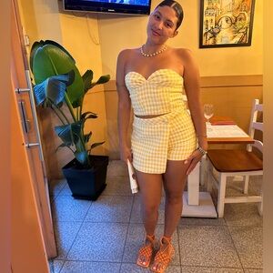 Chic strapless top with matching mini skirt. Yellow and white checkered pattern. Perfect for summer outings.