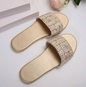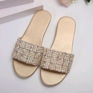 Tweed slide sandals, stylish flats, summer footwear, casual slip-ons, woven sandals, trendy sandals, women’s fashion, gold sandals, comfortable slides, chic shoes