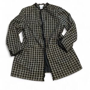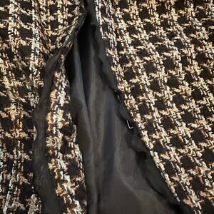 Tweed Jacket with laced ruffle trim and one clip to close black tan and touch of blue