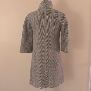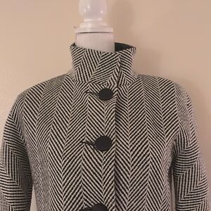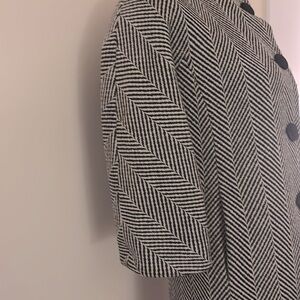 This is a beautifully designed lightweight coat which features 3/4 sleeves, wool tweed fabric, high collar, large matching tweed buttons, nice black satin lining which can be used as a highlight at the collar and/or sleeves. (FYI: I wear a size 4/6 in jackets and coats and it fits me perfectly).
