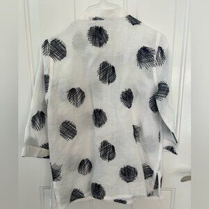 Elevate your wardrobe with this stylish white linen and black embroidered circles women's button down shirt. Perfect for any occasion, this shirt combines comfort with a modern design. Dry clean. Excellent condition;like new! Smoke and pet free home. I ship fast!