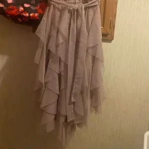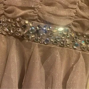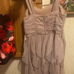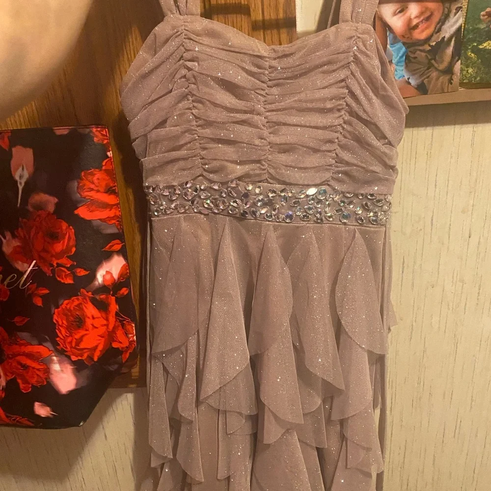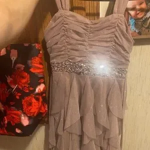 This dress is absolutely beautiful! It’s shimmery all over, it has ruffled layers, it is high-low so it’s shorter in the front and longer in the back, it has a gorgeous gemstone band, and thin straps. It has two strings to tie a bow in the back, and also a zipper. I weighed 105 pounds and I wore it only once, now I am selling it because I am pregnant and trying to save money for my baby, and because I don’t expect to fit in this anymore.