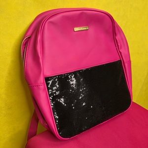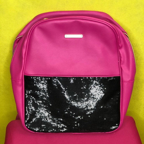 Super Cute Hot Pink Bookbag or travel bag. Designed with black sequins on the out pocket. So room inside and out. Sturdy straps. Brand New without Tag