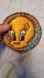 small Round embroidered wicker basket featuring Tweety Bird with vibrant colors. Perfect storing loose change, paper clips or jewelery.
