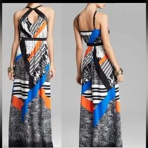 Twelfth St. by Cynthia Vincent Blue Black Orange Abstract Front Cross Maxi Dress everyday fun cute trendy designer spring summer fall autumn date night out evening event dinner brunch sexy classic vacation beach travel