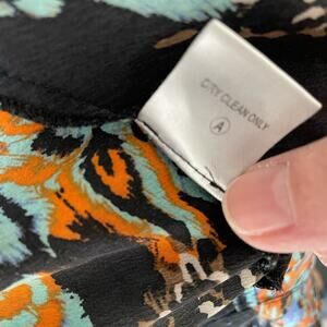 Black with floral & geometric design in blue, coral hints of olive & periwinkle with an asymmetrical long hem in front which could be wore open or tie up.
