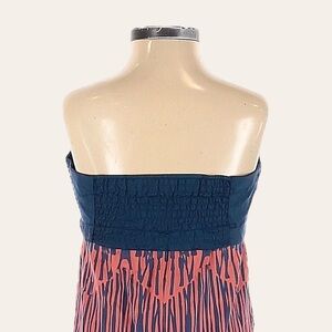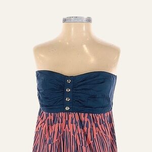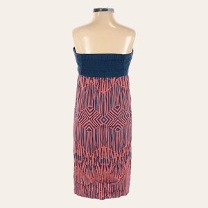 Step into effortless style with this Twelfth Street by Cynthia Vincent strapless midi dress in a striking teal and coral abstract tribal print. Crafted from a luxurious 62% silk / 38% cotton blend, this boho-chic column dress features gold button detail at the bust and a smocked back for visual interest (no stretch).