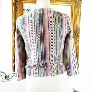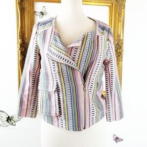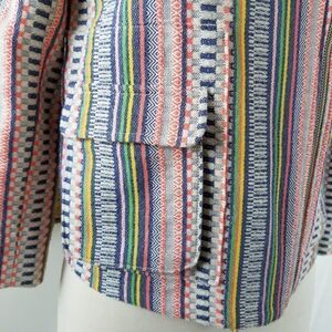 Perfect for spring into summer this boho multi colored tribal print in muted spring colors is a 100% cotton tweed (as described in website) is made up of recycled materials. Brass moto zip with cargo pockets with flap. Jacket is still sold on the website but no longer available in this size.