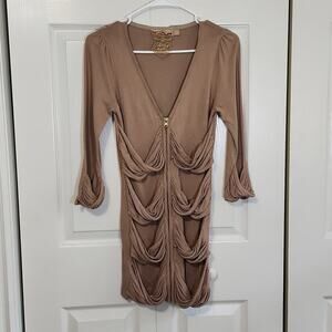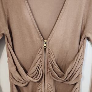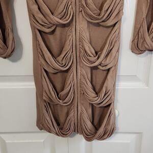 Gorgeous brown sweater dress by Twelve By Twelve Los Angeles. Full zip front. Roll wraps draped across the front & on sleeves. Deep v-neck. 3/4 sleeves. Viscose & silk blend. Minimal piling. In very good condition.