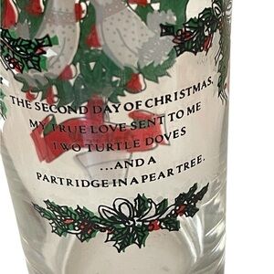Twelve Days of Christmas Glass Tumbler 2nd Day Two Turtle Doves in Tree. This tumbler is in excellent condition. On the back of the tumbler is the second day of Christmas song. This tumbler is 6 inches tall. This tumbler holds approximately 12 ounces when filled to the rim.