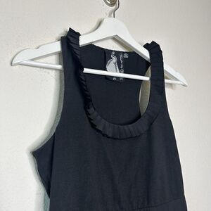 This stunning black dress from Twelve by Twelve is a must-have for any formal occasion. The dress features a flattering fit and flare A-line style with a tiered tulle skirt and a pleated collar. The scoop neckline and sleeveless design add a touch of elegance, while the zipper closure ensures a secure and comfortable fit. Made from a blend of polyester, nylon, spandex, and cotton, this knee-length dress is both stretchy and comfortable. The dress is lined and features a bow back detail for an added touch of whimsy. This little black dress is timeless and versatile! All measurements are approximate, taken flat and closed.