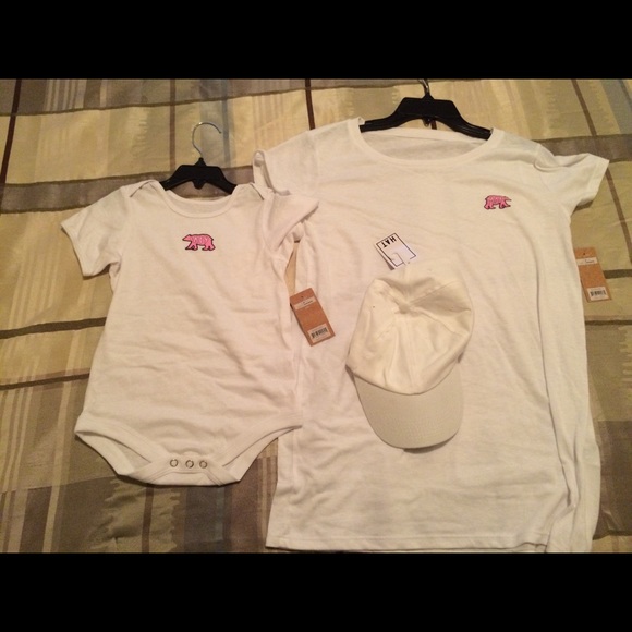 NWT white 'baby' onsies, white 'mama' t-shirt and white hat.