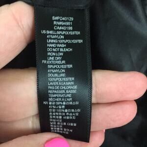 Size M. 100% Polyester. Length strap to hem 31 1/2 inches. Armpit to armpit 14 inches with an elastic back. Adjustable straps. Lined. Great condition!