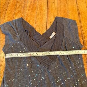 Sparkle effortlessly in this super cute gray sleeveless sweater top from Twenty One, featuring a flattering deep V-neck, ribbed waistband, and scattered iridescent sequins for just the right amount of shimmer. Lightweight and stretchy with a soft feel — great layered or worn on its own.