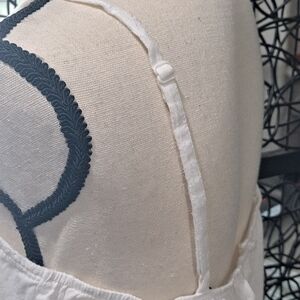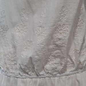 Beautiful white cotton camisole has a flattering peplum bottom, adjustable straps and lovely embroidery. Lace accented neckline.