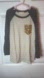 Twenty Second 22nd Long Sleeve Raglan Tee Gold Sequin Pocket Cream 10 / 11. This long sleeve tee features a light cream body with contrasting marled grey sleeves and gold pocket that adds a fancy touch. The round crew neck design and casual style make it perfect casual wear.