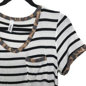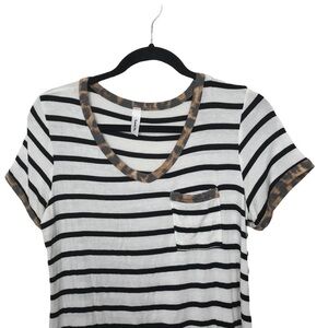 Black and white striped, short sleeve tee with animal print trim. Preowned with some wear. Has stretch.