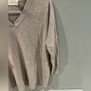 This cozy and versatile light gray sweater is a perfect addition to your wardrobe. It features a flattering V-neckline and 3/4 length sleeves with a ribbed texture on the cuffs and a portion of the arm. The soft, lightweight knit makes it an ideal layering piece for transitioning between seasons. Pair it with jeans for a casual look or over a blouse for a more polished outfit.