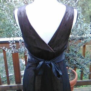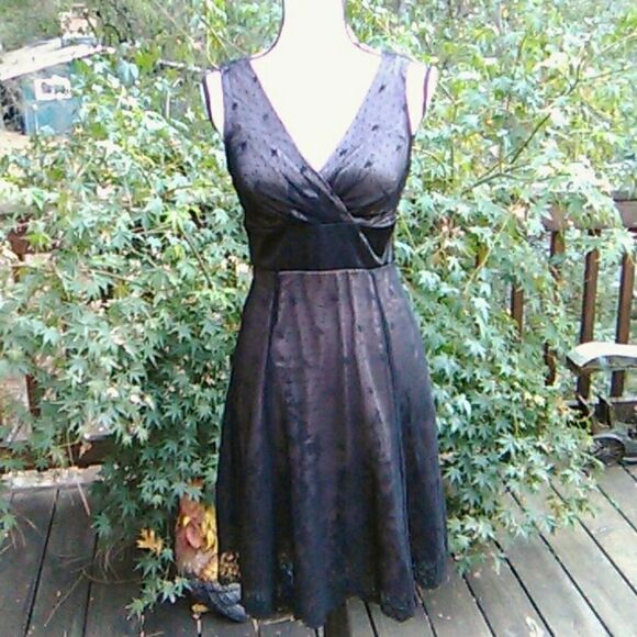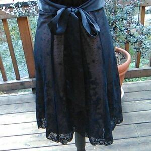 Lovely black lace dress lined with nude satin fabric. Wrap front and back with satin ties. Side zip. Satin waistband under chest. Lace overlay trimmed at the bottom with lace trim in bottom. Size M measures 36 at chest, 30 under chest, ,46 at hips. 39 long from shoulder to hem. This dress is wonderful for an evening out. Comfortable and prettyand sexy.