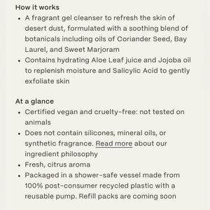 Twentnine Palms Pinyon Poet Body Wash 16.9 fl oz See photos for information straight from the Twentynine Palms website. Item is sold out online. Brand new in box. Outer box has slight wear. See photos for details. Vegan. Cruelty free.