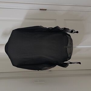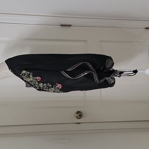Twentyone Brand Size L, Black Embroidered V Neck Sheer Top. Drawstring Sides with Ruffles. Super Cute as is but also makes a great swimsuit cover. Minor wear on threading at sleeves (shown in closeup).