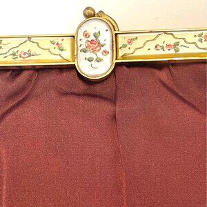 This elegant vintage 1950's-1960's satin evening purse showcases timeless craftsmanship with its polished brown material and intricate hand painted floral accents. Designed for refined occasions, its compact size and durable handle provide both style and practicality.