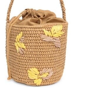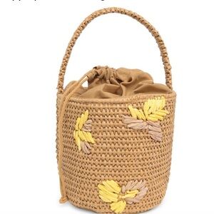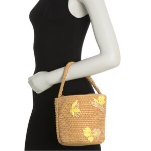 Twig and Arrow Raffia Woven Appliqué Bucket Bag with Floral Accents NWT