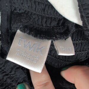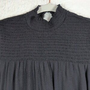 Chic black blouse with smocked detailing. Long sleeves and high neckline. Perfect for versatile styling.0