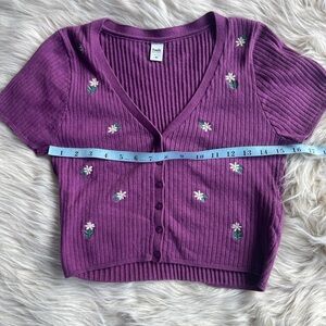 In great condition, Twik Par Simons Daisy Embroidered Purple Button Down V-Neck Short Sleeve Size Small/Medium. Please see measurements. Cotton, Viscose and nylon blend. Very y2k vibes. Please let me know if you have any additional questions.
