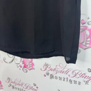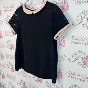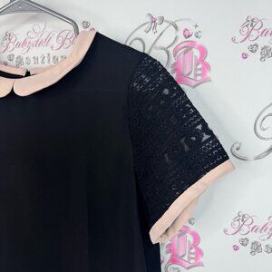 Chic black blouse with soft pink collar and sleeves. Lace detail adds elegance. Ideal for versatile styling. L.