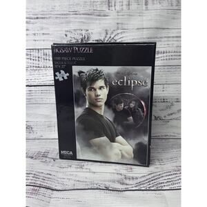 The Twilight Eclipse Jigsaw Puzzle with Jacob and Bella features 1000 pieces made of cardboard, depicting a colorful and detailed scene from the popular Twilight movie franchise. This puzzle, manufactured by NECA in 2009, is perfect for fans of the Twilight series, offering both fun and challenge. With interlocking pieces and a complete set, this puzzle is recommended for ages 14 and up, making it an engaging activity for older teens and adults.
