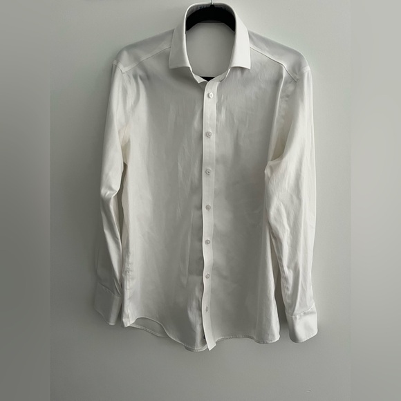 Elevate your wardrobe with this classic white men's shirt that is perfect for any occassion. Made of breathable 4-way stretch fabric that features a Coolmax moisture-wicking tech to keep you dry. Non-iron shirt with a button cuff and collar ring shield.