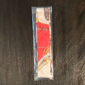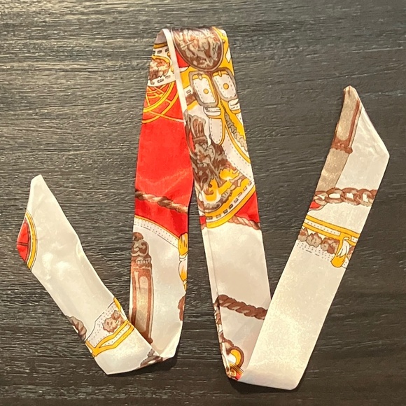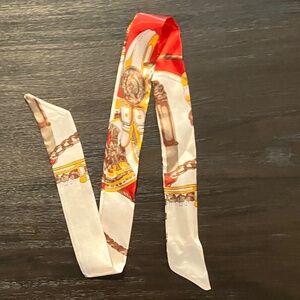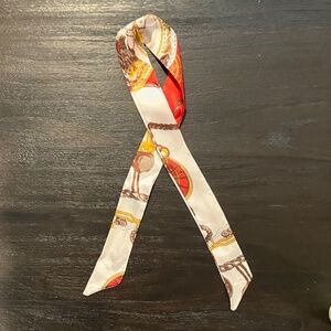 Twilly scarf featuring a vibrant print with orange, brown, and cream tones. Lightweight and versatile accessory suitable for various styling options. Perfect for adding a touch of luxury to your outfit. 33” length, 1 1/2” width.