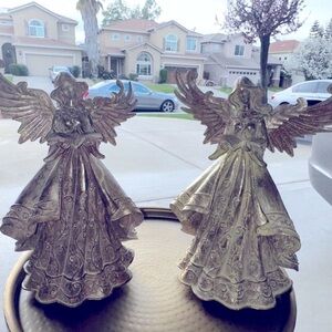 Sold as a set (2) Resin material with metal wings - 2 angels with a 3D flowing robe with flowing hair. Gold Metallic.