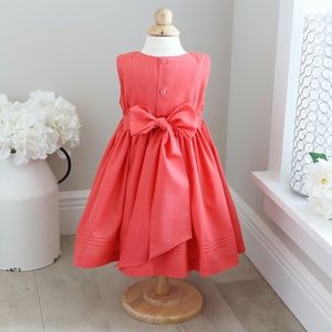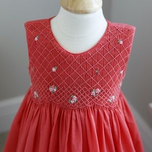 This Luli & Me Smocked Girl's Dress in size 3T is Adorable! The beautiful Hibiscus red color is unique and emulates Spring and Summer!! The amount of floral embroidery is incredible!! The sleeveless dress has a completely smocked bodice done in a beautiful large lattice design on top and a smaller lattice design smock at the waistline. Embroidered floral bouquets and single flowers done in shades of pink, yellow and green are placed throughout the smocked lattice design. An embroidered scalloped border sits where the skirt gathers at the waist. Near the hem are two pin tucks that wrap around the dress. The flared skirt has a tie-back sash for the perfect fit. Upper button back closure with beautiful matching pearlized buttons with "Luli" logo. Dress is fully lined. Perfect for Spring, Portraits, Church, parties, vacations and more. A gorgeous color! Classy and Sassy! Worn Once- Perfect Condition. Still like New!