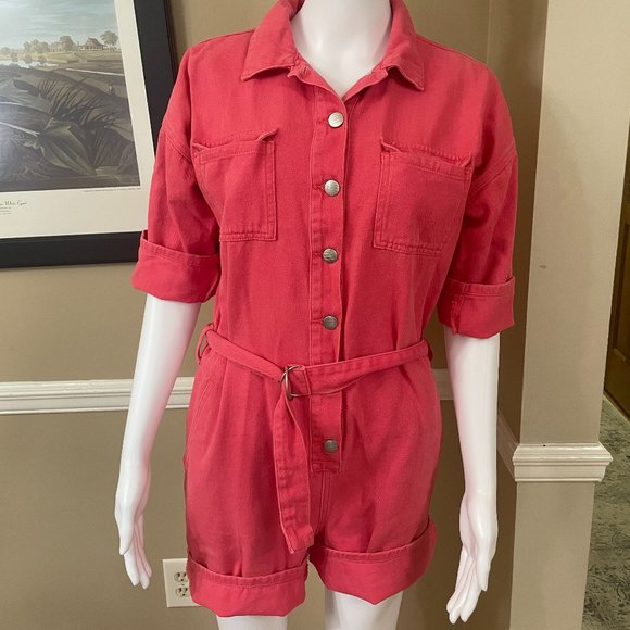 Super cute pink jean romper with adjustable belt - roll cuffs and shorts up for more flattering look - steam/iron for best look