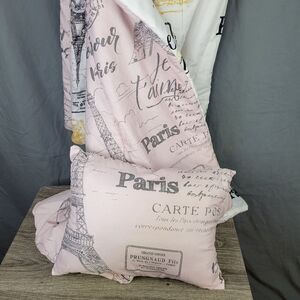 Pretty reversible Paris-themed duvet and pillow set in a gray and pink one one side and white, gray and gold on the other side on both the duvet and the pillow!