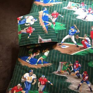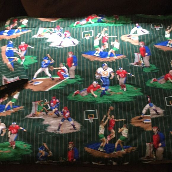 Vibrant sports themed handmade twin size quilt featuring various athletes on a green background. Perfect for sports enthusiasts..