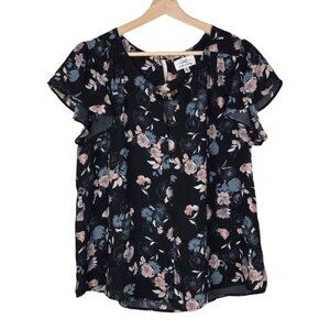 Twine & String Black Floral Flutter Short-Sleeve Top Size X-Large
