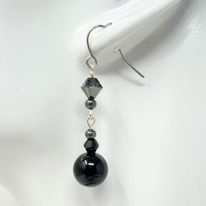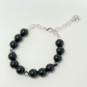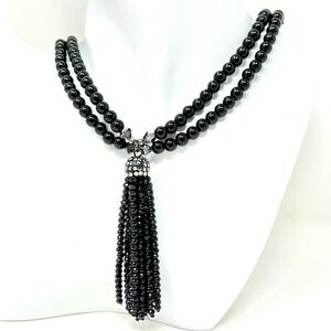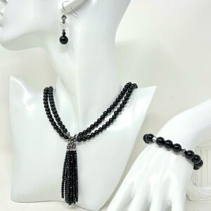 A super fun sparkling tassle is strung with two strands of black jasper beads, accented with Swarovski crystal. Comes with matching earrings and bracelet, also accented with crystal. Necklace length is 19 inches with an extender to 20.75 inches. Bracelet measures 7.25 inches with an extender and the earrings (on hypoallergenic wires) measure 1.75 inches.