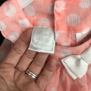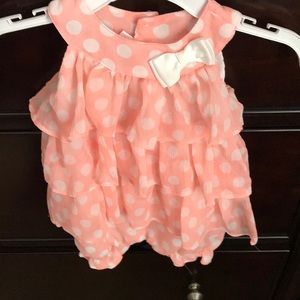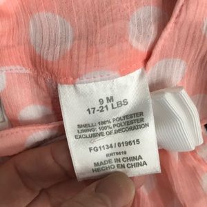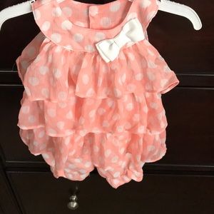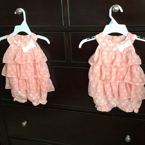 Two matching peach Rompers with white polka dots and a white bow. Button closure at the bottom. Extremely cute and In EUC.
