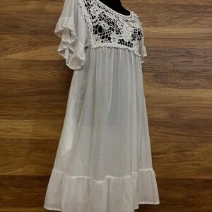 This is a beautiful white dress made by simona Barbieri. Giving all the prairie core vibes & I love the baby doll silhouette. Well known & made in Italy. this dress here is breath takin from the open chest with crotchet flower appliques, the material is so soft and free flowing. made from 50%cotton and 50% viscose a beautiful combination for superior comfort Sleeves are wide short sleeves with ruffles on ends. Dress has beautiful ruffle on bottom also has 2 pockets on each side. Ties in a big bow in back. Size Lg measurements are approximately lying flat pit to pit 21" length 36" like new!!