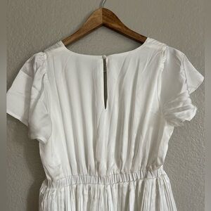 Lulus Twirl-wind Romance White Satin Tiered Midi Dress! Sleek woven satin shapes this lovely dress that features a lightly gathered bodice and a surplice neckline, framed by fluttery short sleeves. Back button closure secures atop a keyhole cutout. An elasticized, banded waist tops a flouncy, tiered midi skirt with pleated detailing throughout.