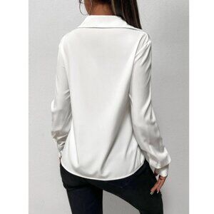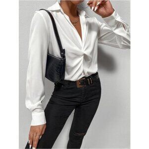 Twist Front White Office Shirt Long Sleeve Collar Neckline V-Neck
