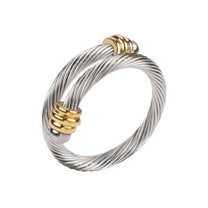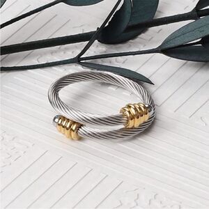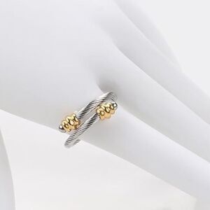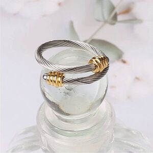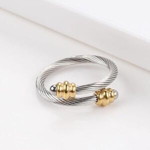 The dainty ring is two tone, silver twisted cable wire chain and plated gold in two ends. There is a stainless steel ball in each end. The twisted cable wire ring is made of stainless steel nickel free.