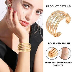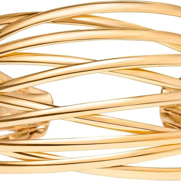 Statement Twisted Cuff Bracelet Gold cuff bracelet features hollow and multi-layer wire was interlaced design. The hollow bracelet is lightweight, shiny and comfortable to wear. The dainty bangle adds a touch of luxury and sophistication to any outfit. Many women are wearing the similar bangle bracelets in the dazzling stage to show their fashion and unique charming
