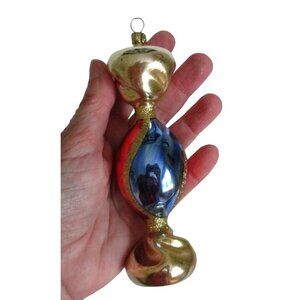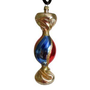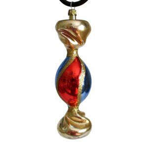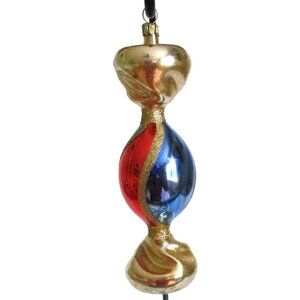 This vintage Italy glass Christmas ornament features a striking twisted candy shape. Its vibrant white, red and blue hues are complemented by gold glitter accents. Ideal for adding a classic touch to holiday décor, it offers a unique and colorful addition to any festive setting.