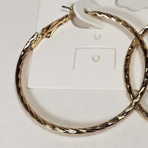 These Gold Tone Twisted Wire Hinged Leverback Latch Hoop Earrings are a stylish choice for any occasion. They feature a twisted wire design and measure 1.75 inches in diameter New without tag